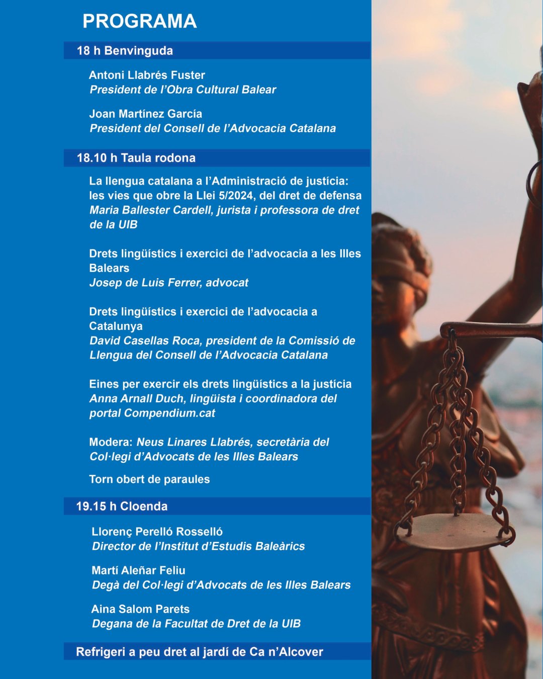 L’OCB i el Consell de l’Advocacia Catalana organitzen la taula rodona titulada «La llengua catalana i els drets lingüístics a l’Administració de justícia de les Illes Balears». Una trobada emmarcada en la campanya ‘La justícia, també en català’ per analitzar la situació actual de l’ús del català a l’àmbit judicial i debatre sobre els reptes i garanties dels drets lingüístics de la ciutadania.