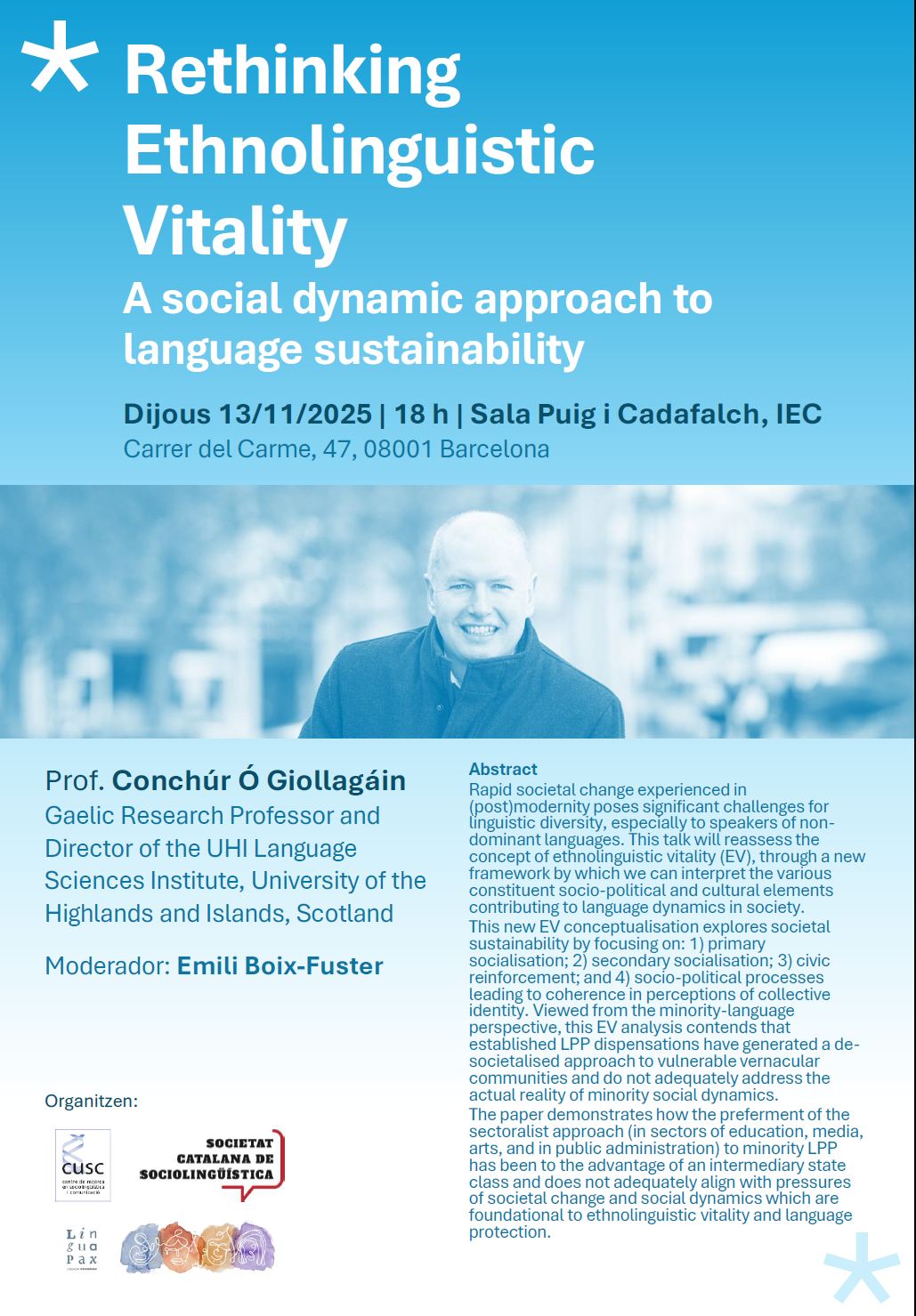 A càrrec de Conchúr Ó Giollagáin (professor de University of the Highlands and Islands), moderada per Emili Boix i Fuster, i coorganitzada per la SOCS, Linguapax i el CUSC.