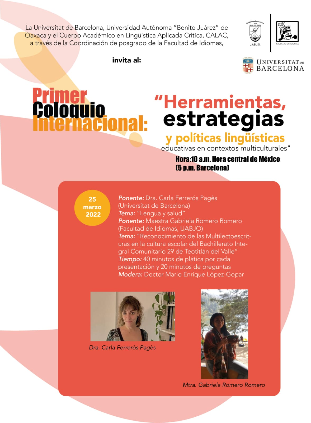 La UB i la Universidad Autónoma Benito Juárez de Oaxaca us conviden a la segona sessió del Col·loqui. Aquesta vegada hi parlen Carla Ferrerós (Lengua y salud), de la UdG, i Gabriela Romero (Reconocimiento de las multilectoestrituras…), de la UABJO. Aquest és l’enllaç: https://videoconferencia.telmex.com/j/1244846647