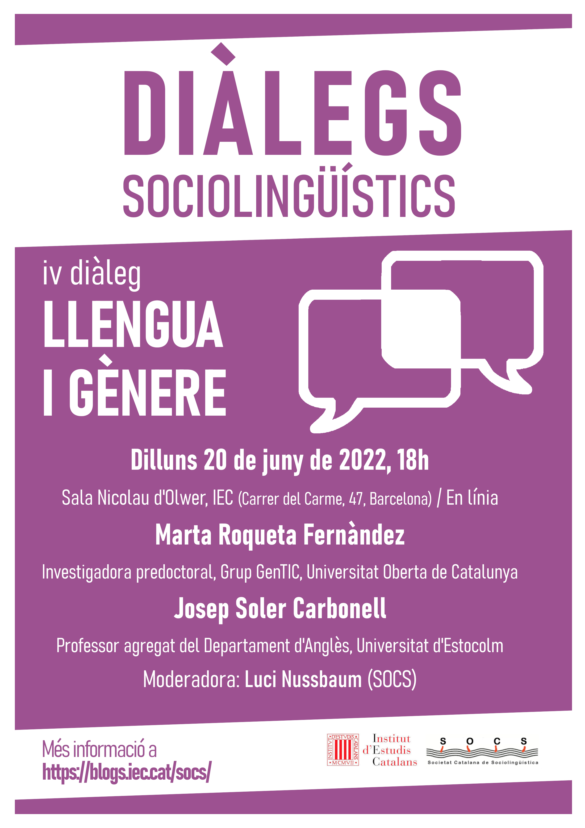 Diàlegs sociolingüístics IV: Llengua gènere, 20 de juny de 2022, a les 18 hores. Marta Roqueta i Josep Soler