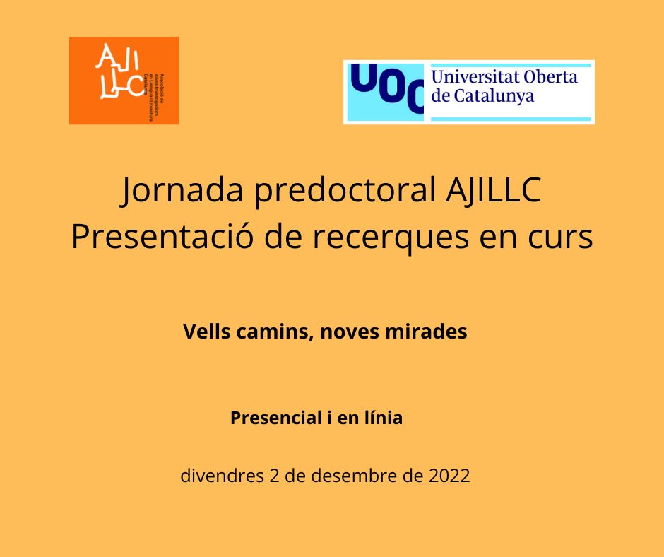 Des de l’Associació de Joves Investigadors en Llengua i Literatura Catalanes (AJILLC) tenim el plaer de convidar-vos a la jornada de doctorands que se celebrarà el proper divendres 2 de desembre de 2022 a la Universitat Oberta de Catalunya (UOC): Vells camins. Noves recerques. Jornada predoctoral AJILLC: presentació de recerques en curs. Aquesta jornada comptarà amb una ponència inaugural per part de dos professors de la UOC, Maite Puigdevall i Joan Pujolar, i amb les comunicacions de doctorands procedents de diferents universitats: Camille Marvin (UOC), Alba Adiego (UB), Mariona Arnau (UPF), David Cluselles (UOC), David Ginebra (UAB) i Judit Pujol (UdG). Per poder participar-hi, tant presencialment com en línia, és menester la inscripció en el següent enllaç: https://scur.cat/GXCJ38.