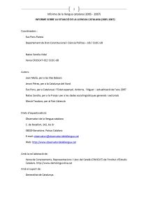 Dimecres 28 d’octubre de 2009 tindrà lloc la presentació de l’Informe sobre la situació de la llengua catalana (2005 – 2007) a la seu d’Òmnium Cultural (Carrer Diputació, 276, de Barcelona. Sala d’actes). Amb: Dra. Eva Pons, professora de dret constitucional de la Facultat de Dret Constitucional de la UB, Natxo Sorolla, sociolingüista i investigador de la Xarxa Cruscat de l´Institut d´Estudis Catalans i Dr. Xavier Vila, professor de sociolingüística del Departament de Filologia catalana de la UB i director de la Xarxa Cruscat de l´Institut d´Estudis Catalans.