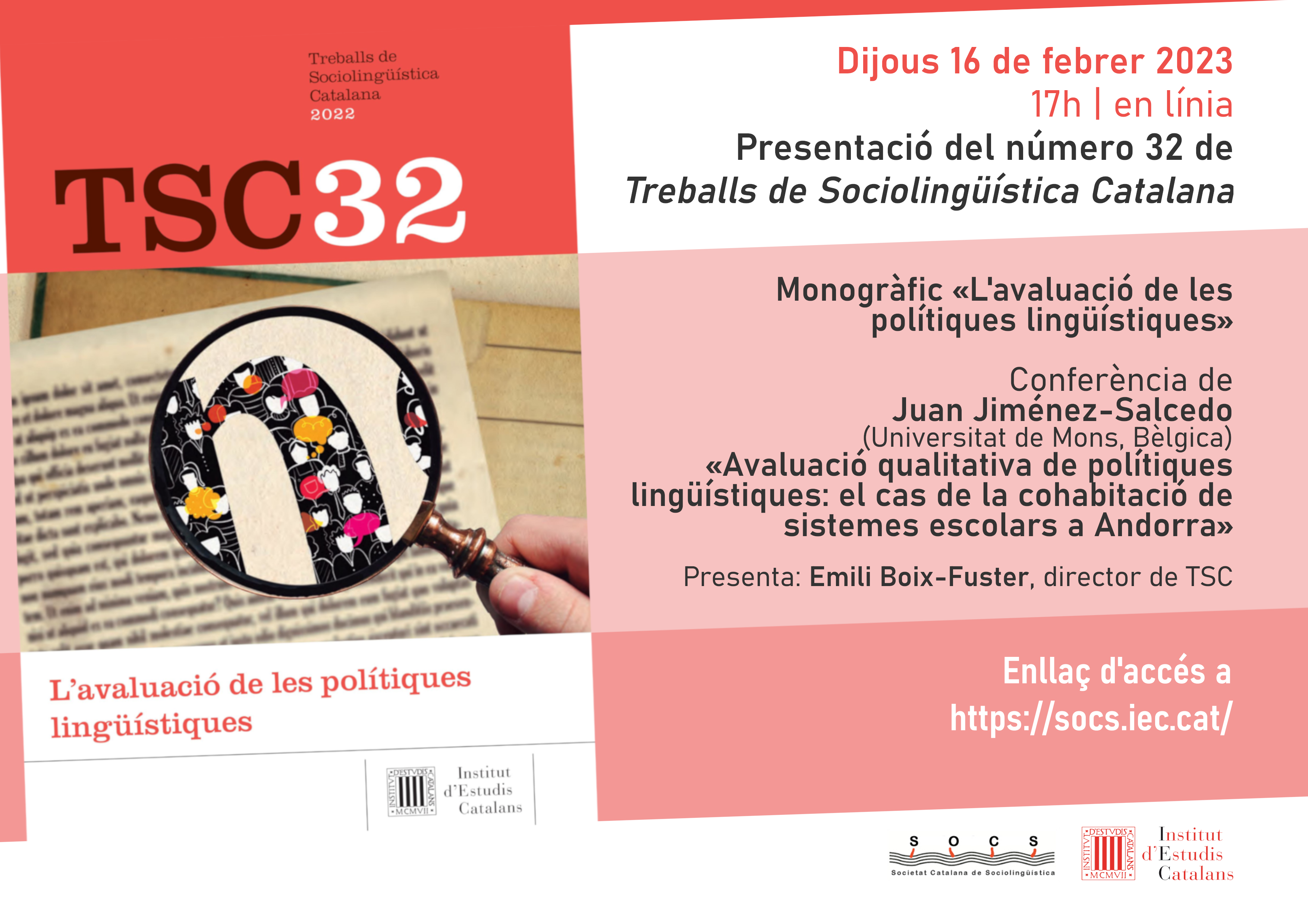 El proper dijous dia 16 de febrer a les 17h la Societat Catalana de Sociolingüística organitza la presentació del número 32 de Treballs de Sociolingüística Catalana, amb una secció monogràfica dedicada a l’avaluació de les polítiques lingüístiques. En l’acte hi intervindran Emili Boix-Fuster, director de la revista, i Juan Jiménez Salcedo (Université de Mons, Bèlgica), que impartirà una conferència al voltant del seu article “Avaluació qualitativa de polítiques lingüístiques: el cas de la cohabitació de sistemes escolars a Andorra”, publicat dins de la secció monogràfica. L’acte es durà a terme en línia, i s’hi podrà accedir des de l’enllaç que podeu trobar a http://socs.iec.cat/