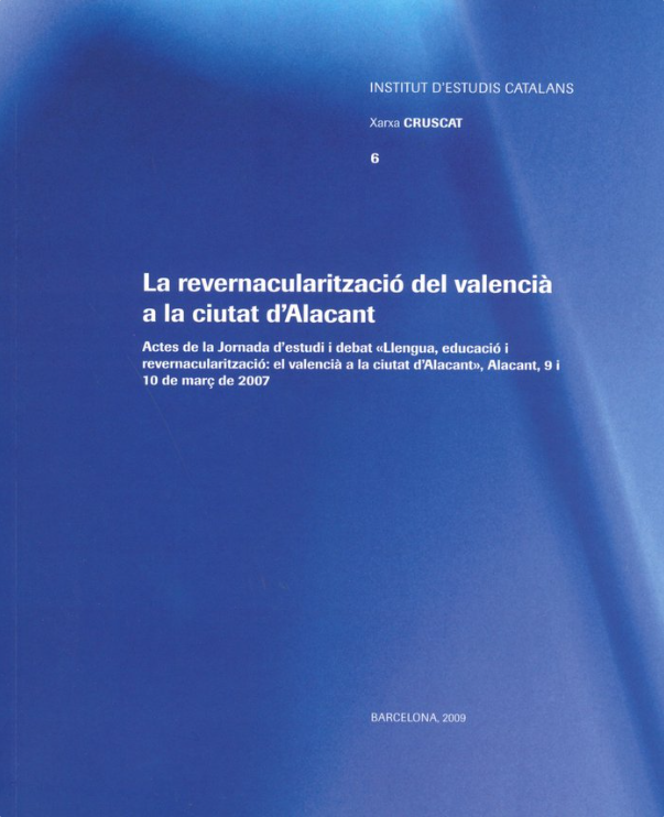 «La revernacularització del valencià a la ciutat d’Alacant: actes de la jornada d’estudi i debat “Llengua, educació i revernacularització: el valencià a la ciutat d’Alacant”, Alacant, 9 i 10 de març de 2007». Col·lecció Xarxa CRUSCAT, 6.